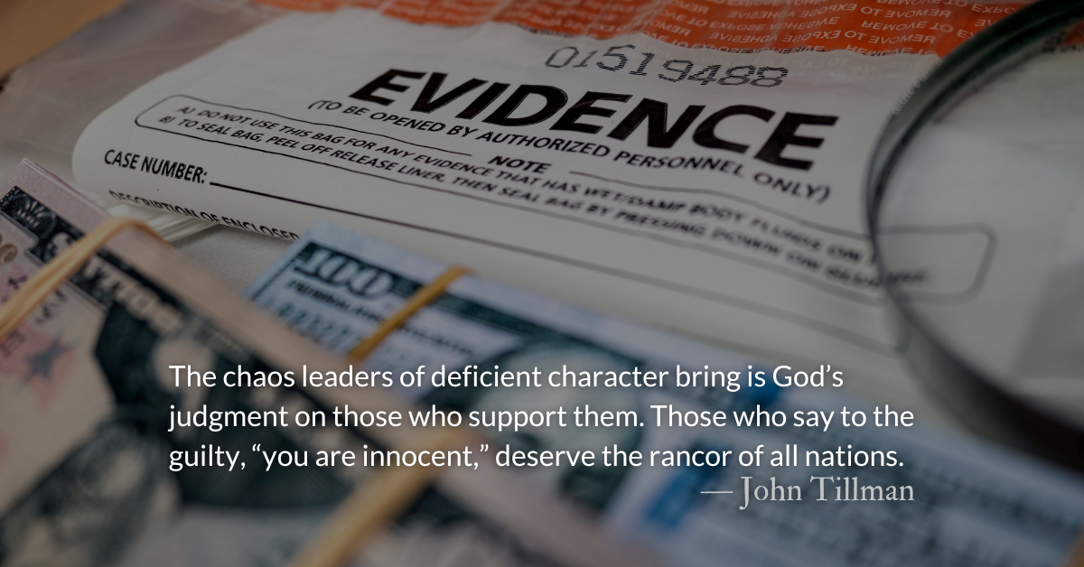 The chaos leaders of deficient character bring is God’s judgment on those who support them. Those who say to the guilty, “you are innocent,” deserve the rancor of all nations. (Proverbs 24.24)