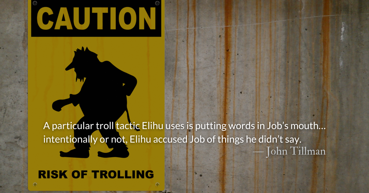 A particular troll tactic Elihu uses is putting words in Job’s mouth. Job never said God was in the wrong or that not sinning was worthless (v. 2-3). Whether intentionally or not, Elihu accused Job of things he didn’t say. He made a “strawman” argument that he could easily attack for verse after verse after verse.