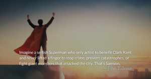 Links for today’s readings: Read: Judges 15 Listen: (3:13) Read: Hebrews 2 Listen: (2:47) Links for this weekend’s readings: Read: Judges 16 Listen: (5:59) Read: Hebrews 3 Listen: (2:25)Read: Judges 17 Listen: (1:50) Read: Hebrews 4 Listen: (2:43) Scripture Focus: Judges 15.9-15 9 The Philistines went up and camped in Judah, spreading out near Lehi. … Continue reading Selfish Supermen