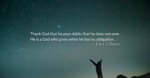 Scripture Focus: Job 41.1111 Who has a claim against me that I must pay? Everything under heaven belongs to me. Job 42.10-1110 After Job had prayed for his friends, the Lord restored his fortunes and gave him twice as much as he had before. 11 All his brothers and sisters and everyone who had known him … Continue reading Unobligated God